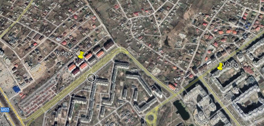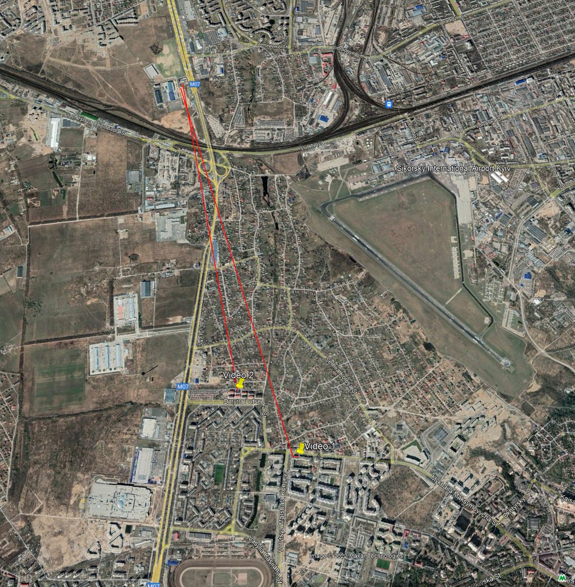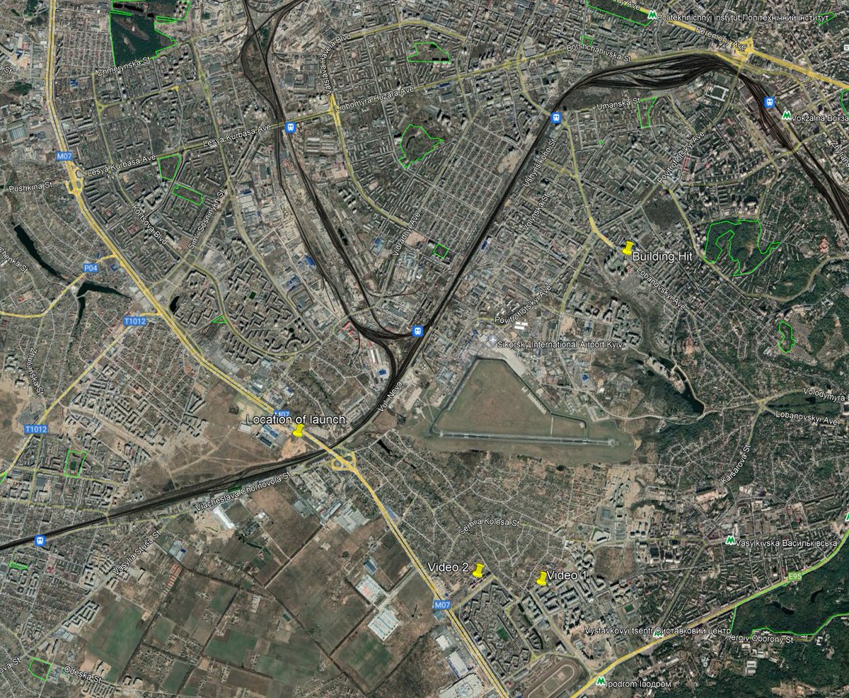 A few others and I quickly geolocated this video to a neighborhood south of Kiev and near Sikorsky International Airport. This video also shows the missile trail arcing towards where the building was hit.