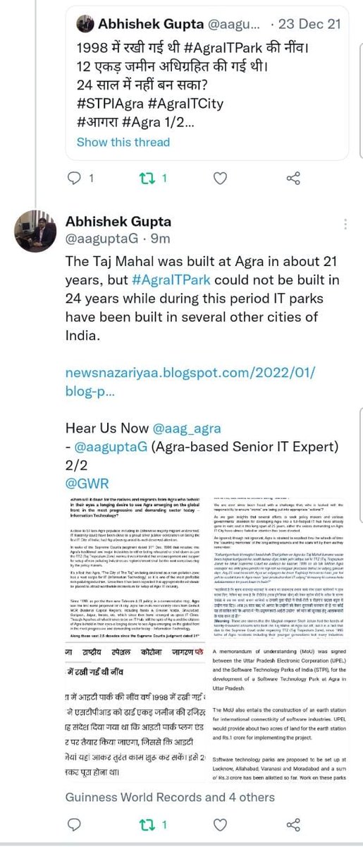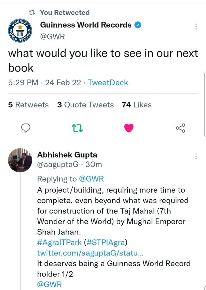 14 साल से प्रयासरत रहते हुए अब मुझे लगता है आगरा को "24 साल से विलंबित (stalled)" #AgraITPark project को Guinness Book of World Records में इस record के लिए दर्ज करवा ही लेना चाहिए।