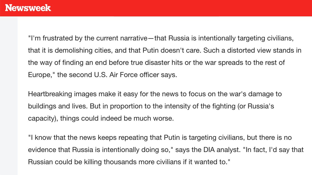 "I'm frustrated by the current narrative—that Russia is intentionally targeting civilians, that it is demolishing cities... Such a distorted view stands in the way of finding an end before true disaster hits or the war spreads to the rest of Europe," -U.S. Air Force officer