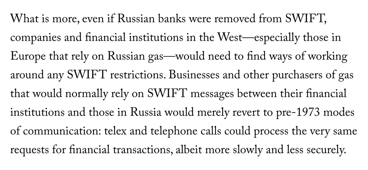 Daleep Singh & others in US government have clearly stated sanctions are structured to spare energy sector since it's there that 🇷🇺 has systemic importance for global economy. One concern about SWIFT that is shared in Berlin is that if you cut 🇷🇺 off it will disrupt gas payments.