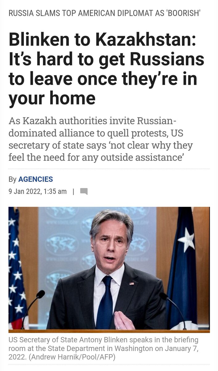 3) "The White House questioned the need for Russian forces in Kazakhstan on Friday, with US Secretary of State Antony Blinken warning Kazakhstan that "once Russians are in your house, it's sometimes very difficult to get them to leave."