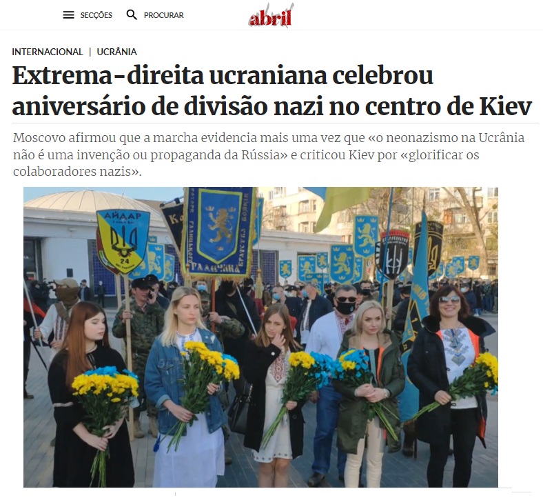 A matéria cita como exemplo do processo de nazificação o fato de que as autoridades ucranianas estão organizando celebrações para comemorar o aniversário de criação da 14.ª Divisão de Granadeiros da Waffen SS Galizien, a chamada Divisão Galícia (ou Divisão Galega).
