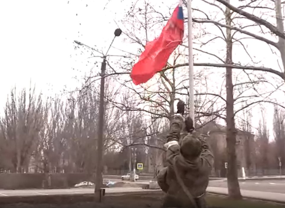Los milicianos antifascistas de la Republica Popular de Donestk, bajaron la bandera de la ocupación ucraniana en la ciudad de Melitopol después de liberarla y ondearon una bandera comunista de la victoria al lado.