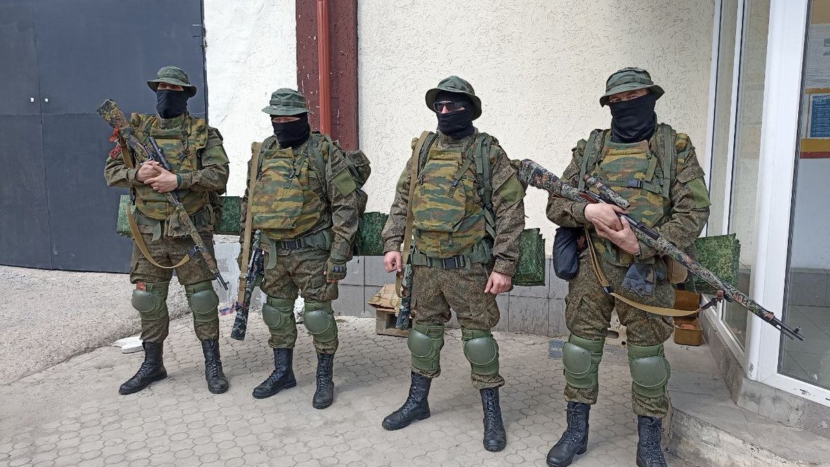 Fuerzas especiales rusas Spetsnaz, miembros de la unidad especial "O" enviada a Donbás, llevan la bandera soviética en sus uniformes.