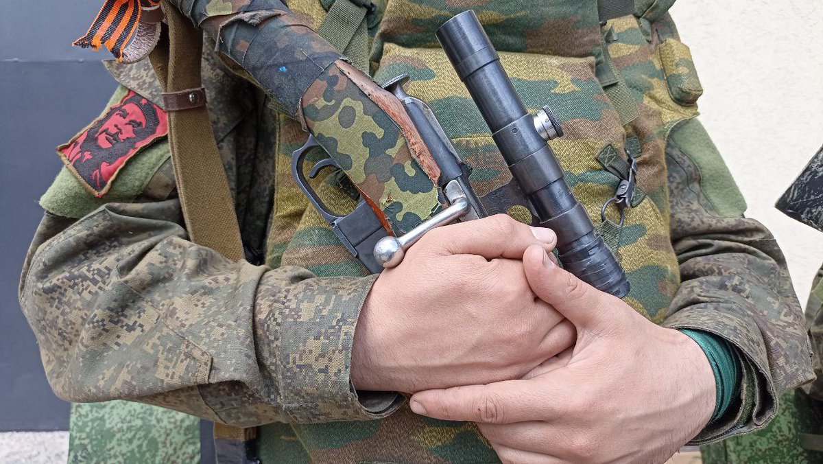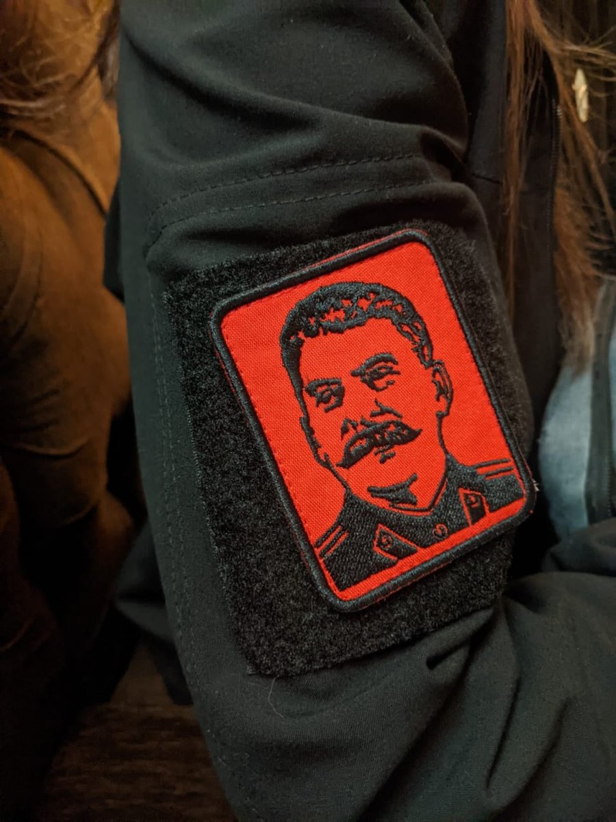 Francotiradores de la milicia de la República Popular de Donetsk posan con parches del Che Guevara y una voluntaria de la milicia lleva un parche con un retrato de Stalin.