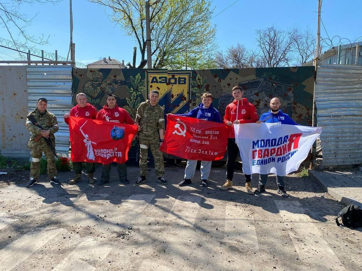 Jovenes comunistas posan con una Bandera de la Victoria delante la base asaltada de los nazis del Batallón Azov, en Mariupol.