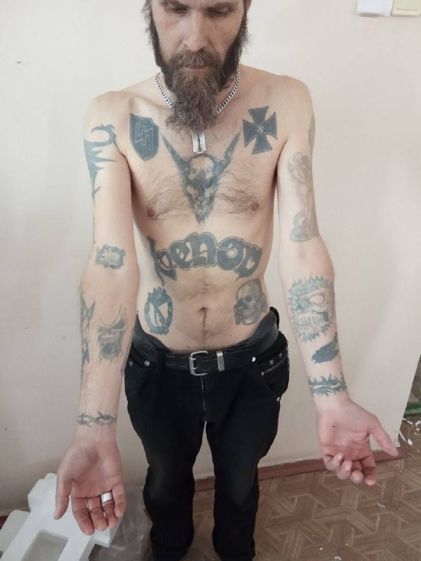Otro nazi ucraniano capturado por las milicias y las tropas rusas cuando intentaba escapar de Mariupol, tiene la cruz de hierro y la calavera Tottenkopf, además de un tatuaje satánico en el pecho.
