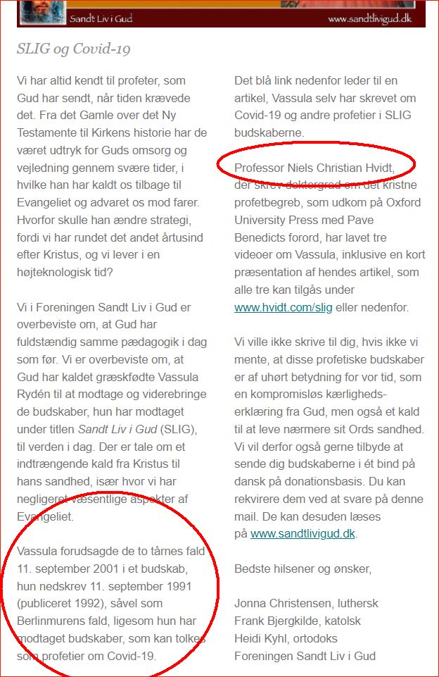 Hendes gamle ven, professor på SDU, Niels Christian Hvidt promoverer løbende Vassula og blåstempler hendes rabiate udsagn..