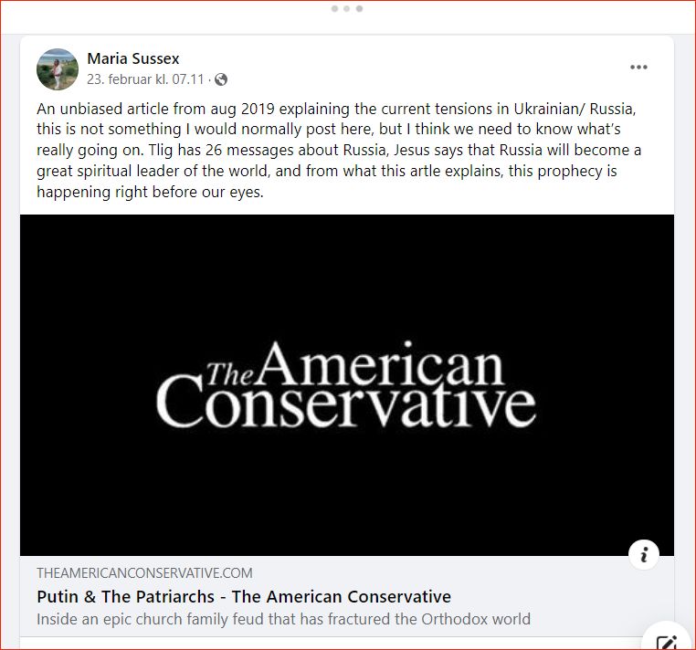 I FB gruppen 'True Life in God Friends' - (TLIG er den int. versionen af SLIG) omtales igen "profetien" fra Vassula om at "Jesus says that Russia will become a great spiritual leader of the world" - og den kobles sammen med Putins krig mod Ukraine.