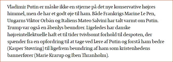 Det er i lyset af det sidste, man skal forstå Iben Thranholms grænseløse anprisning af Putin - men hun er ikke alene.