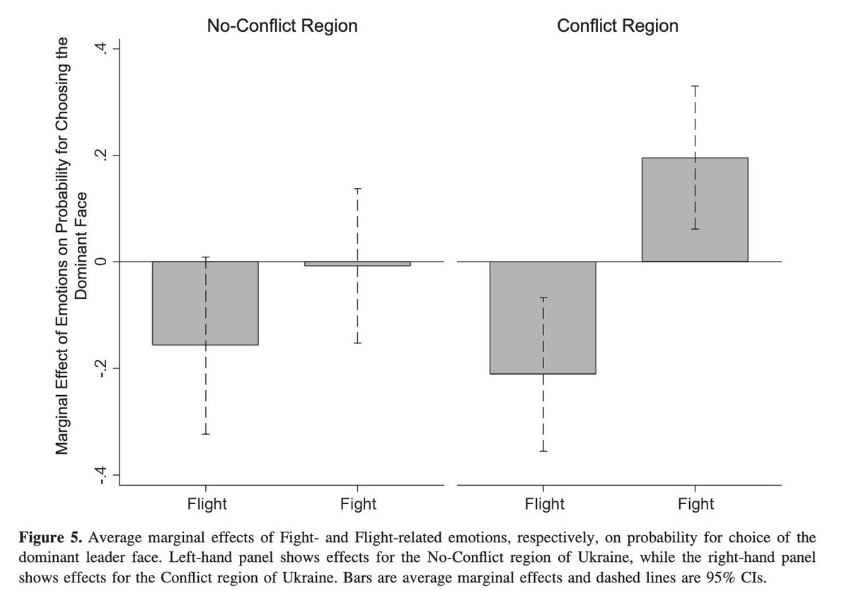 But not everyone feels the same. We studied this when Russia invaded Crimea in 2014. In the face of the invasion, feelings of anger increased support for dominant leaders among those in the affected regions. Feelings of fear decreased support (doi.org/10.1111/pops.1…) (7/16)