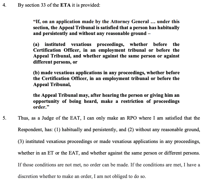5/ As Eady P explained, giving T an RPO of indefinite duration doesn't prevent him from ever bringing a claim again, but means he can only do so with EAT permission, on the EAT finding proceedings aren't an abuse of process and have reasonable grounds.