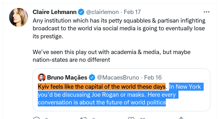 3/ "sided with GAE" - whatever happens in Ukraine, it will not weaken the dreaded GAE. Putin is not a great savior here; his impact on domestic politics and *culture* in the west is limited. taking sides in foreign war doesn't fix our own domestic culture-politics.