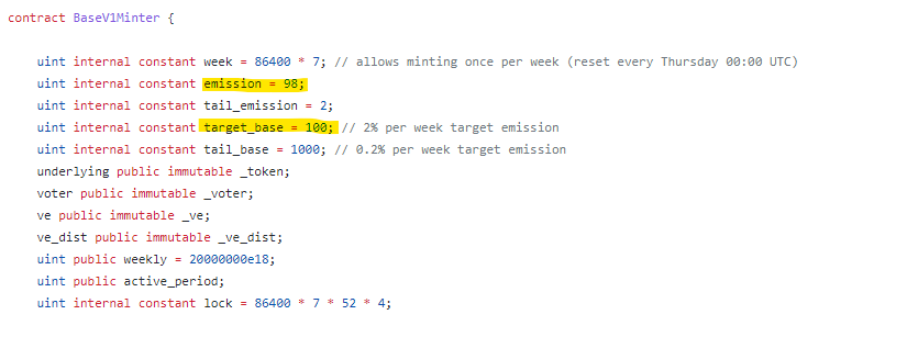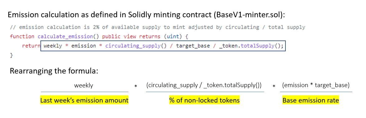 In the Solidly contracts, the emission amount is based on three factors: 1. Last week's emission amount (starting with 20M in week 1) 2. % of non-locked tokens 3. A base emission rate that is adjusted using 1 & 2 (5/10)