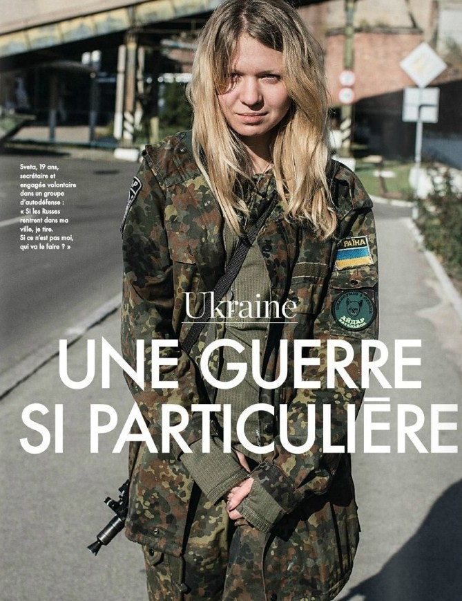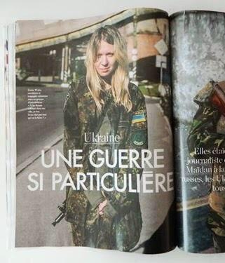 Nazismo com glamour: pouco tempo após o início dos conflitos armados entre ultranacionalistas ucranianos e minorias russas pós-Euromaidan, a revista francesa de moda Elle publicou uma matéria especial sobre Victoria Zaverukha, uma miliciana ucraniana.