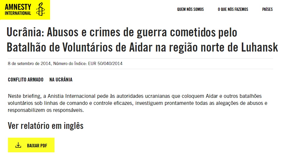 O Batalhão de Aidar é uma organização paramilitar neonazista financiada e armada pela CIA e posteriormente integrada ao Ministério da Defesa da Ucrânia. O grupo é acusado de cometer diversas atrocidades e crimes de guerra contra a minoria russa de Donbass.