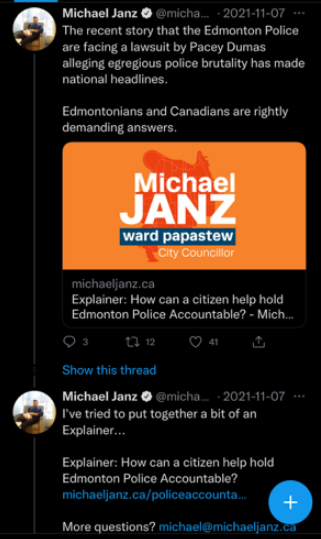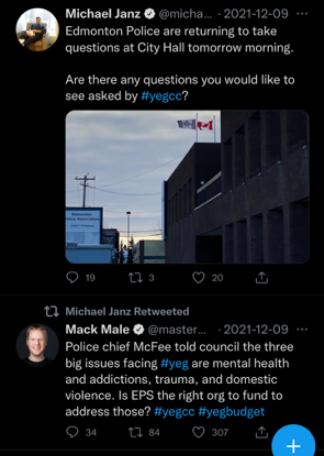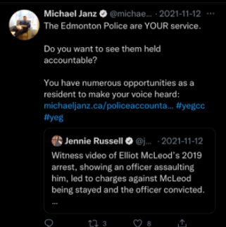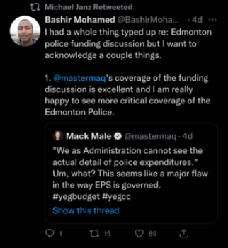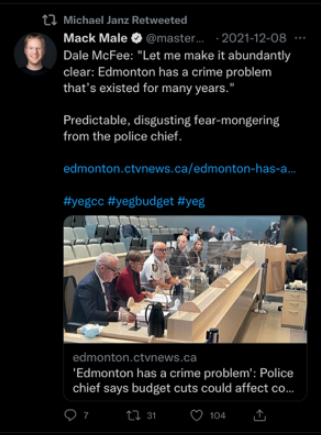 Below is every single tweet that was submitted to the Integrity Commissioner by Staff Sgt. Michael Elliott as part of his code of conduct complaint against Councillor Janz. Every single complaint was dismissed. Below we have two "known critics," Engel and Mohammed. #yegcc
