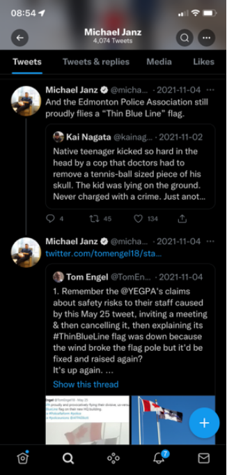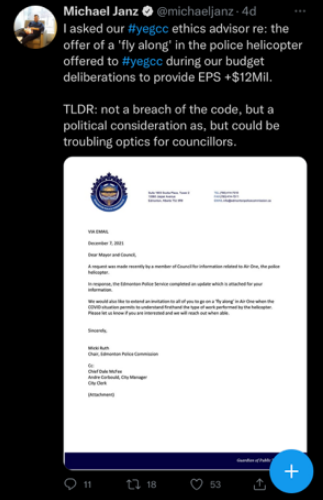 The EPA do not like Janz bringing up just how little transparency there is around the police budget. We've also got the now infamous offer of free helicopter rides that was extended by Chief McFee to councillors. More thin blue line flag pictures and a RT of @mastermaq
