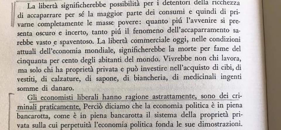 «La libertà significherebbe possibilità per i detentori della ricchezza di accaparrare per sé la maggior parte dei consumi e quindi di privarne completamente le masse più povere:
