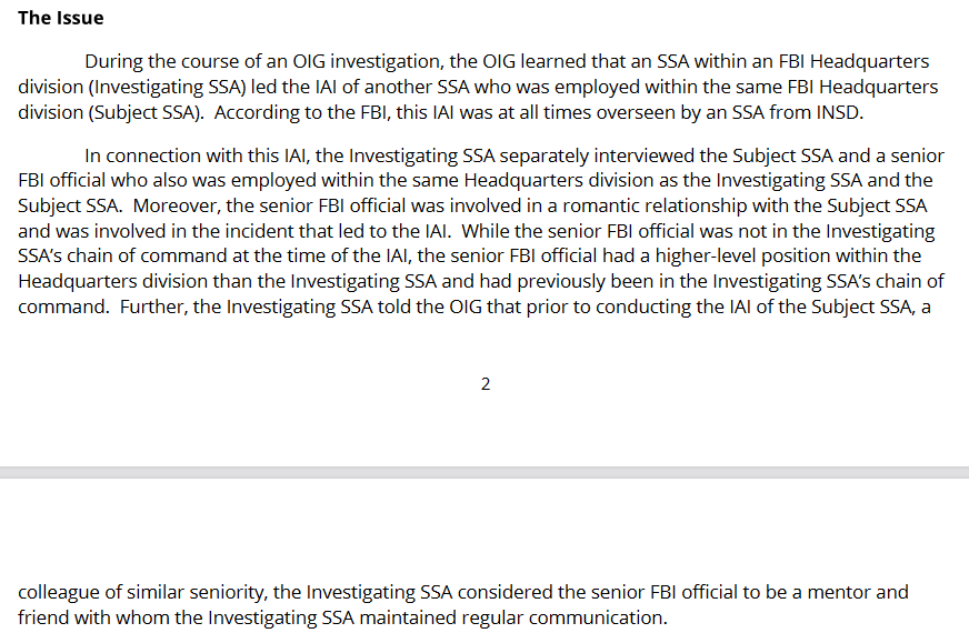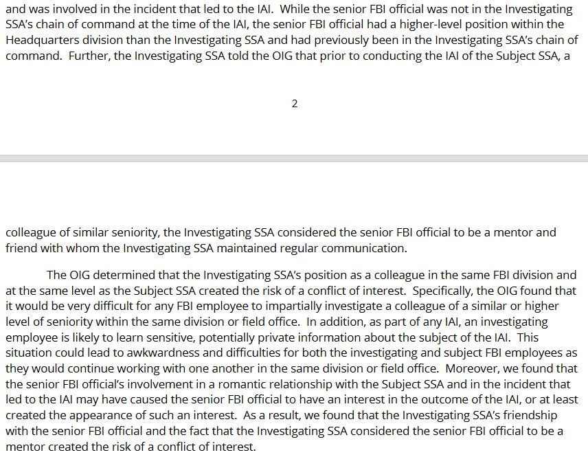 Someone at FBI HQ assigned a SSA to investigate another SSA that they used to work for. Leading to conflicts in investigating the SSA for various issues & a romantic relationship between the SSA & another senior FBI official. oig.justice.gov/sites/default/…