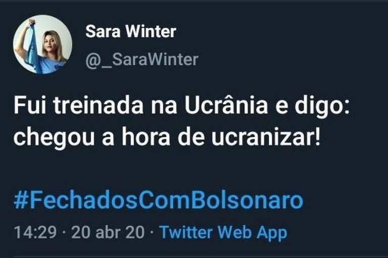 A extremista Sara Winter foi uma das primeiras a exortar a ucranização do Brasil. Ela chegou a tentar criar uma milícia armada em Brasília, denominada "300 do Brasil", mas acabou sendo presa após liderar um ataque ao STF.