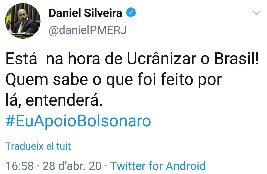 O deputado Daniel Silveira, conhecido por intimidar professores e jornalistas e por quebrar a placa de Marielle Franco, também exortou a ucranização do Brasil. Ele foi preso pouco tempo depois, logo após publicar um vídeo elogiando o AI-5 e ameaçando os ministros do STF.