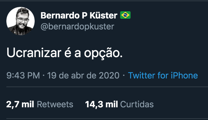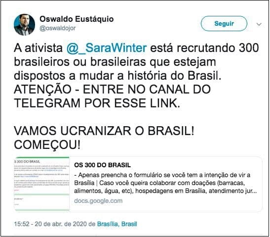 Oswaldo Eustáquio, outro blogueiro bolsonarista preso por envolvimento com fake news e atos antidemocráticos, não apenas externou seu endosso à ucranização como ajudou a recrutar voluntários para a iniciativa.