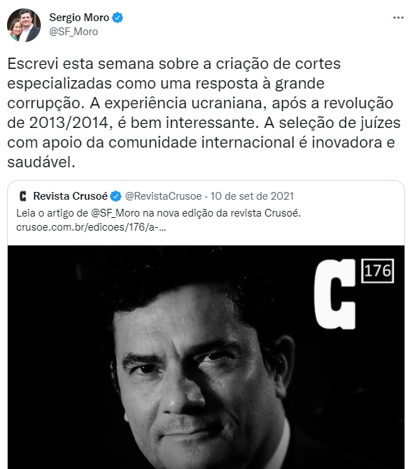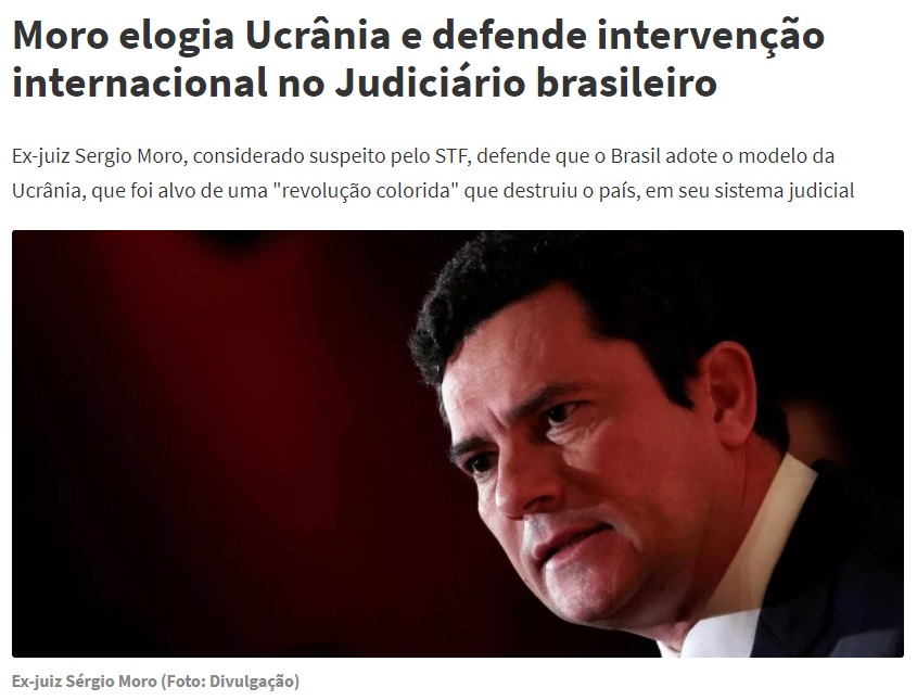 O ex-juiz Sergio Moro também não poupou elogios à nação europeia, chegando a sugerir que o Brasil adotasse o mesmo princípio de subordinação do sistema judiciário às forças externas, seguindo os passos da Ucrânia após o golpe de 2014.