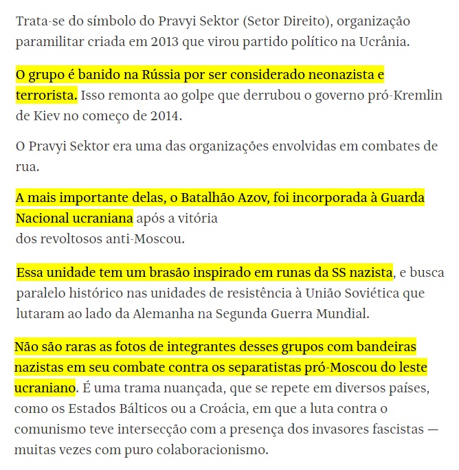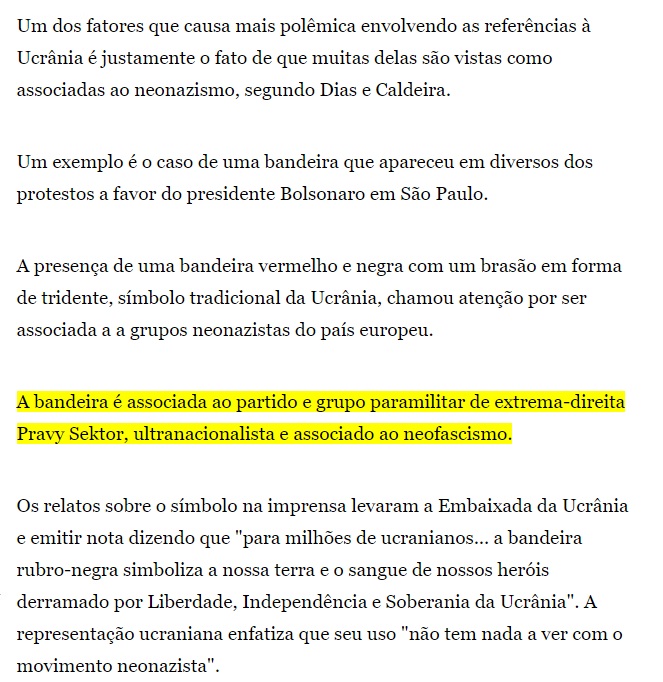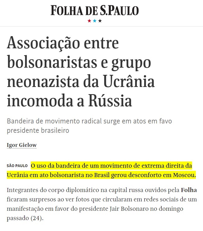 Quem vê o noticiário da imprensa brasileira, carregado de apelo à emoção e loas à "democracia soberana" da Ucrânia, dificilmente associaria a nação do leste europeu ao mesmo país que se tornou referência máxima da extrema-direita bolsonarista.