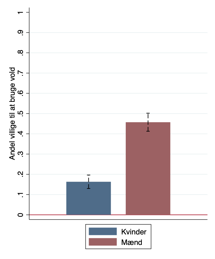Mænd er - ikke overraskende - særligt tilbøjelige til at forestille sig, at de vil bruge vold mod et fremmed autoritært regime. Blandt mændene er det 46 %. Blandt kvinderne er det blot 16 %. (4/6)