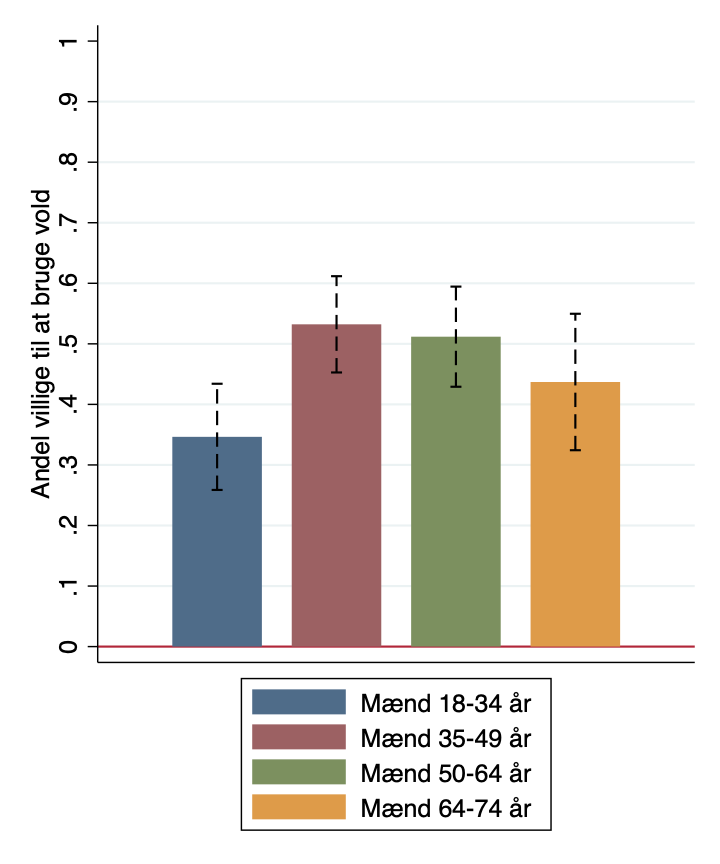 Det er måske mere overraskende, at det særligt er de midalderende, som forestiller sig, at de vil bruge vold. De unge mænd, som ellers generelt er mere risiko-villige, er mere tilbageholdende. (5/6)