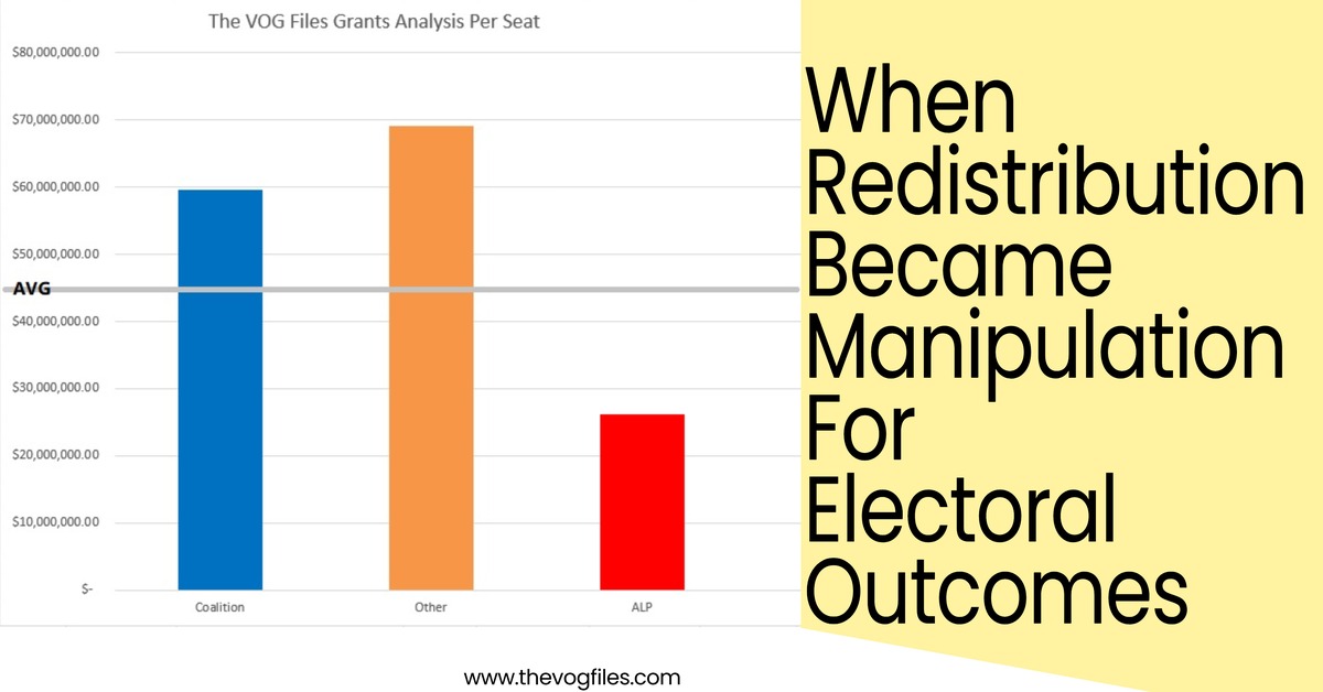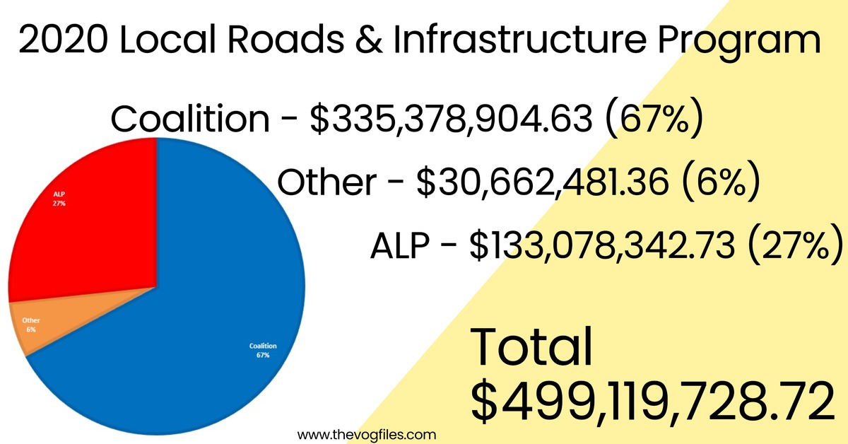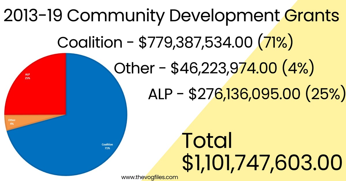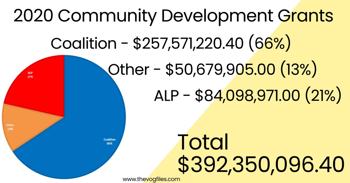 of $97.4 million per seat, The LNP, $47.7 million per seat. The Liberals $57.1 million per seat and the ALP seats got an average of $26.1 million per seat. The liberals have 44 seats, the LNP, 23 Seats and the Nationals 10 seats. Labor have 68. the party who control most of these