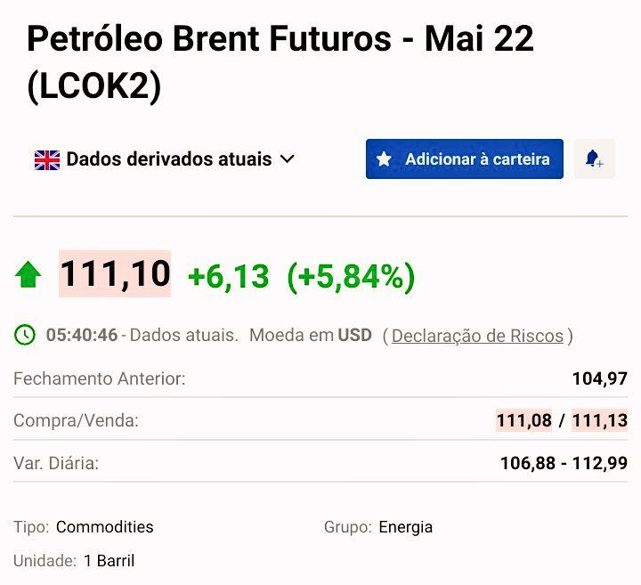 Barril de petróleo sendo negociado a 111 dólares nesse momento. Bom dia!