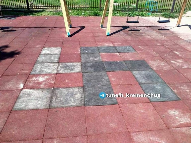 Ocorre que os ucranianos são muito distraídos. Quando foram colocar o calçamento nesse parque infantil na cidade de Kremenchug, mal perceberam que o padrão formava uma suástica, acredita? Ai, ai, como são avoados.