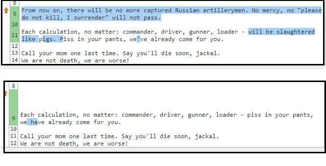 "From now on, there will be no more captured Russian artillerymen. No mercy, no 'please do not kill, I surrender' will not pass. [...] will be slaughtered like pigs." (tool text-compare.com)