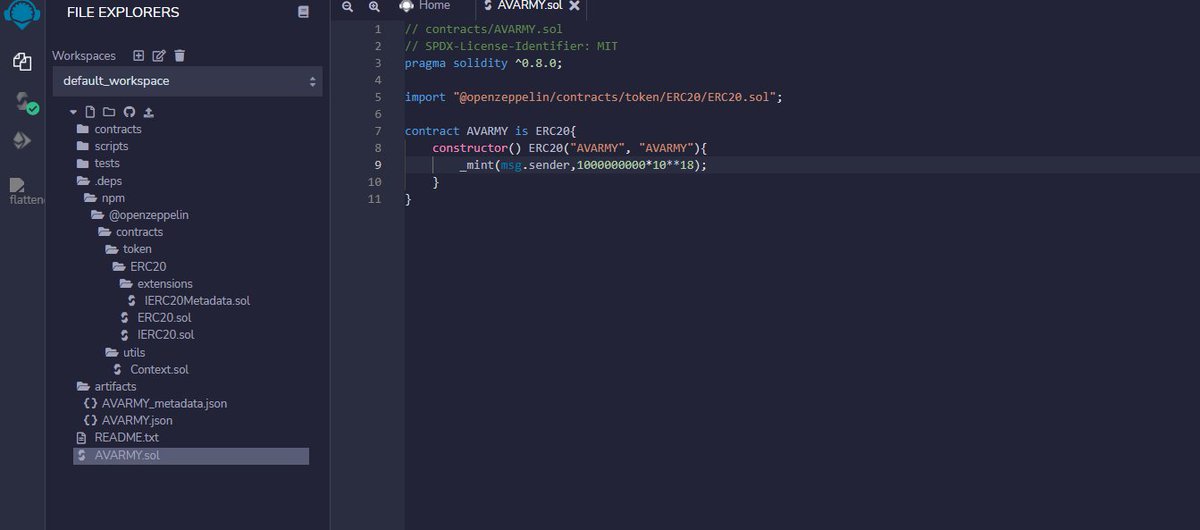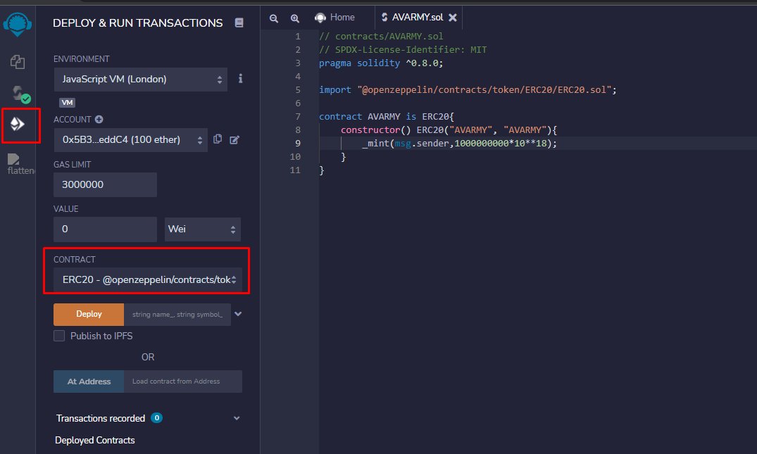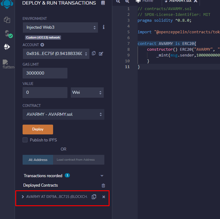 2.9 Şimdi tokenimizi deploy edebiliriz, yine sol tarafta ethereum logosuna benzer kısım var oraya tıklayın ve açılan sayfada kontratınızı bulun, yukarıda isim verdiğiniz kontartı seçin benimki " AVARMY "