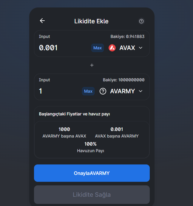 3.9 ve son olarak ilk fiyatı ve likiditesini belirliyorum örneğin 1 AVARMY 1 AVAX veya 1 AVARMY'nin değeri 0.001 #AVAX'tır diyelim ve likiditeyi onaylayıp ekleyelim.