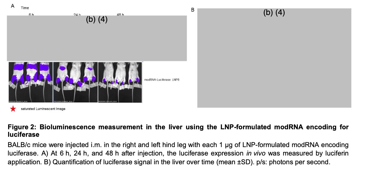 Page 19 implies that all modRNA-LnP8 was tested for bioluminescence at all time points, yet it seems everything but the 6h time point is redacted. So is the buffer control.