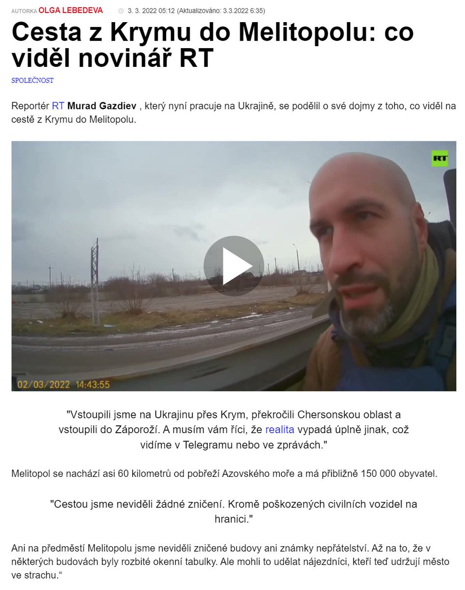 Reportér státní RT hlásí: žádné škody tu nejsou! "Cestou jsme neviděli žádné zničení. Kromě poškozených civilních vozidel na hranici."