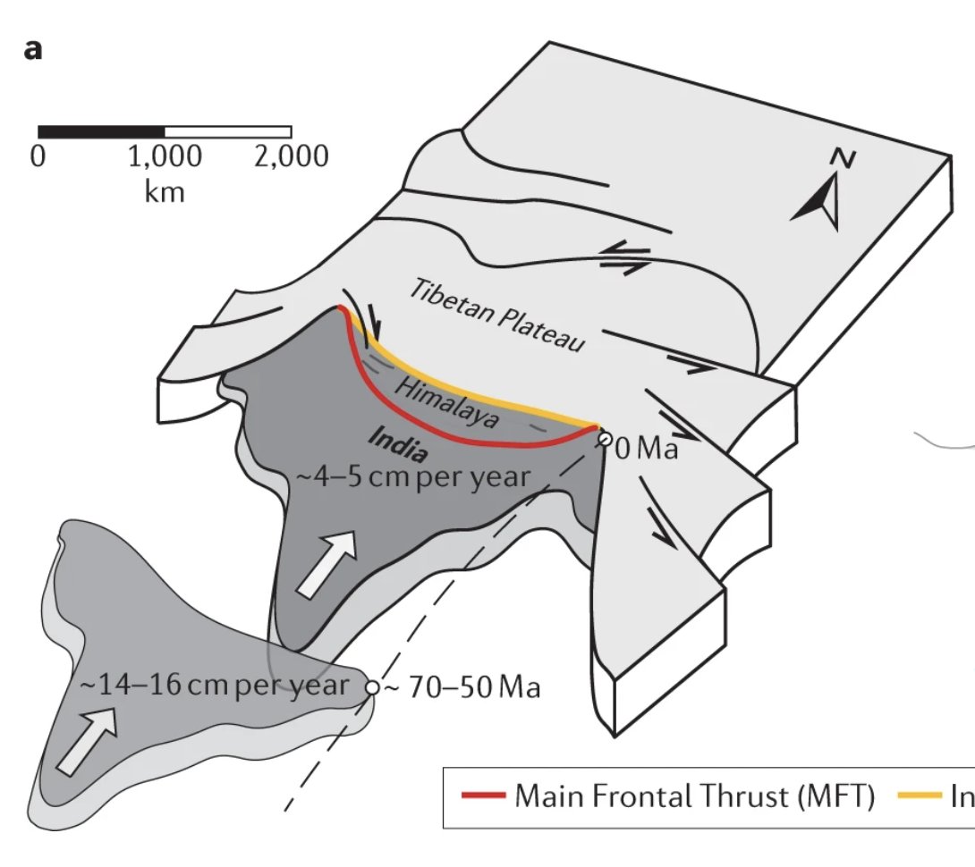 But the question of how exactly the crust got thick remains debated. One plate slid under another? Giant thrust faults progressively active from south to north? Flow of deep material?
