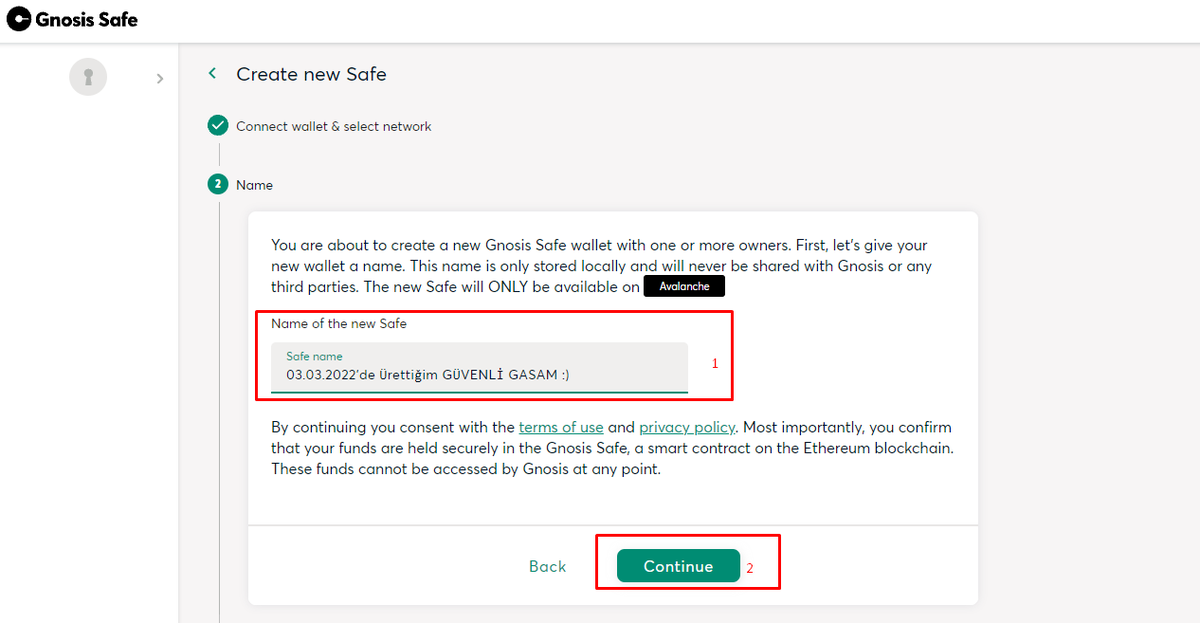 4. Şimdi #Avalanche'da oluşturduğumuz güvenli contract'ımıza veya kasamıza bir ad verelim , bu ad yalnızca yerel olarak saklanır ve @gnosisSafe veya herhangi bir üçüncü şahısla asla paylaşılmaz, ve ardından continue diyelim.