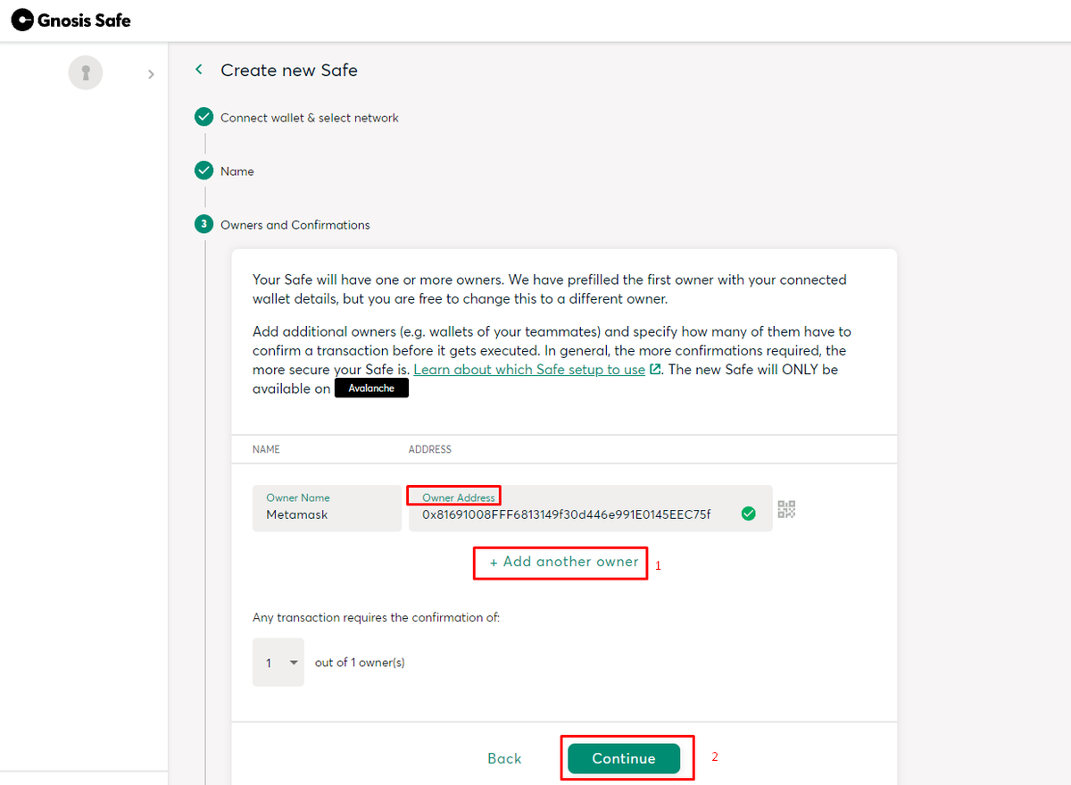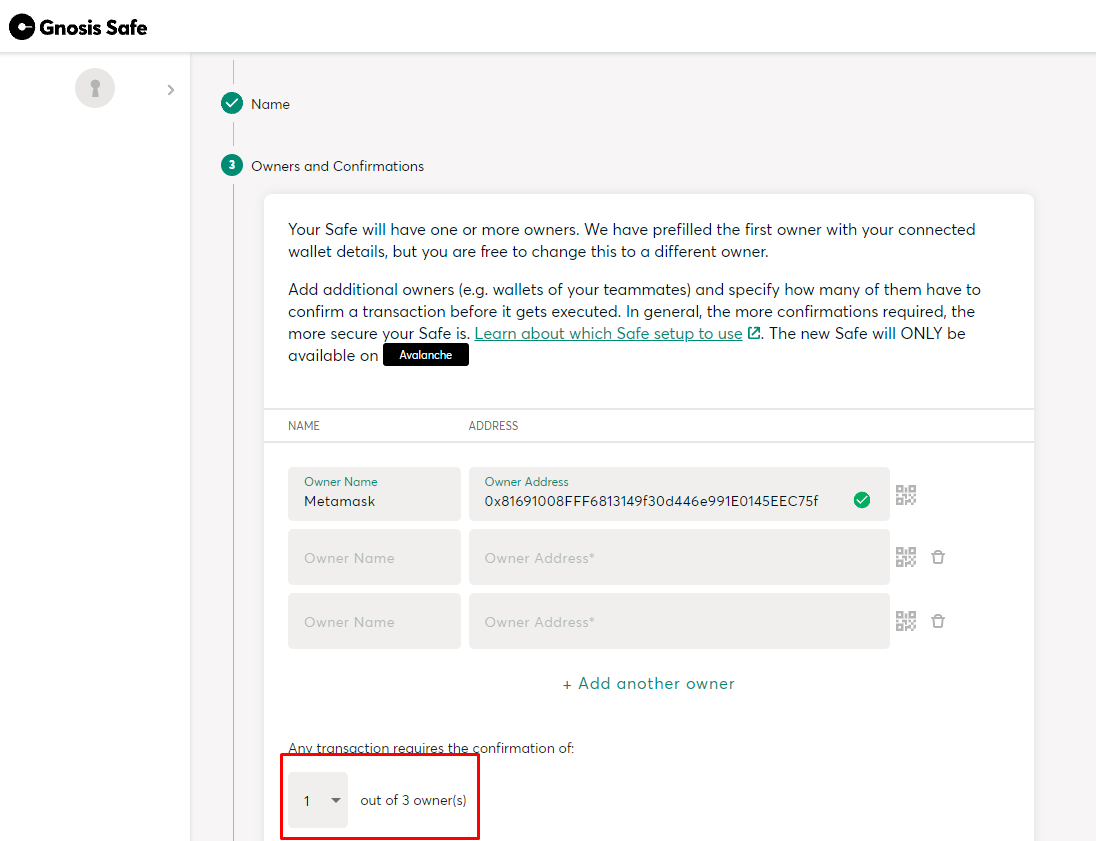 5.1 add another owner diyerek daha fazla yetki sahibi ekleyebiliyorsunuz, yetkiden kasıt kasa içerisindeki varlıklarda onay veren adresler.