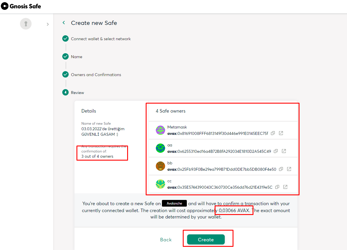 6. benim seçtiğim 4 adresten 3'ü onay verirse kasadaki varlıklar hareket edebilir hale geliyor ve create diyoruz.