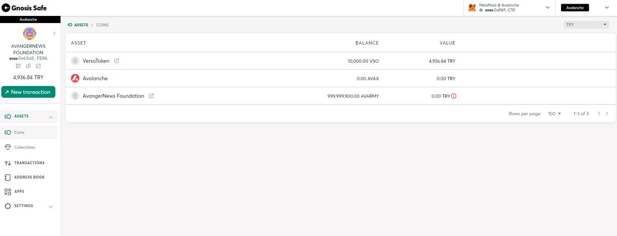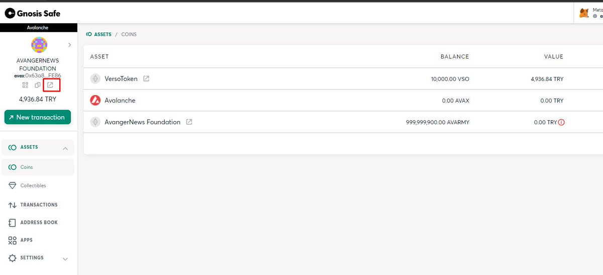 10.1 Kasanıza varlık eklemek için snowtrace.io veya gnosis sitesinde size verilen kontrata göndermeniz gerekiyor varlıklarınızı.