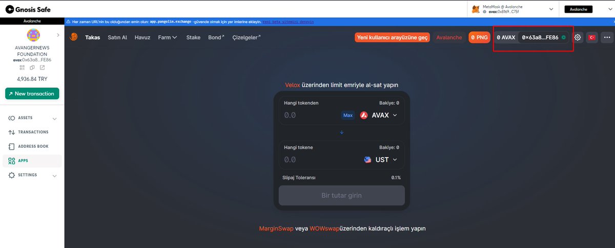 10.8 @pangolindex 'ı seçtiğimde bana gömülü olarak dex'i açıyor ve swap stake vb unsurların hepsini sunuyor, sağ üstte görüyorsunuz kasamızın kontratını.