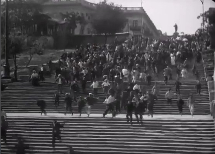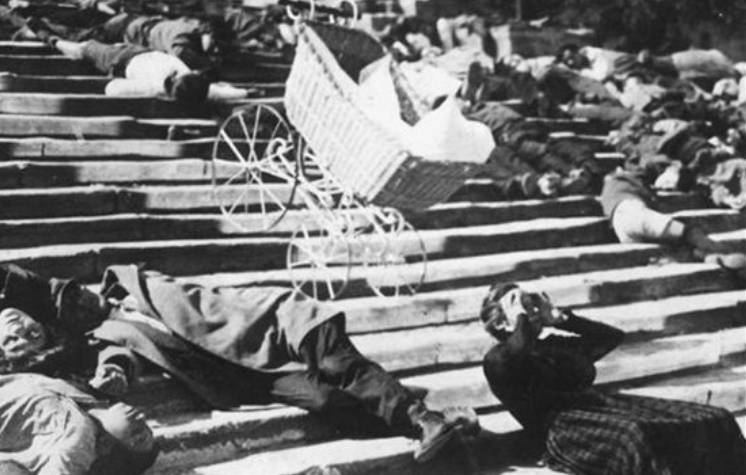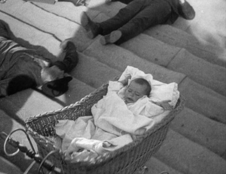 Poi si vede una carrozzina col bambino che rotola per la scalinata. E sua madre che muore.