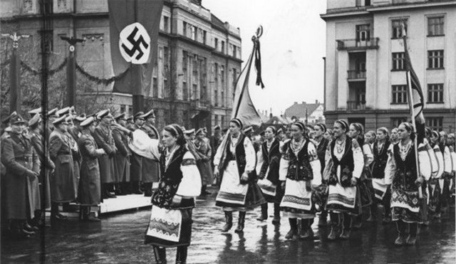 ...e defendia ações como a deportação, desapropriação das terras e erradicação da cultura das etnias consideradas "inferiores". Ao lado das tropas nazistas, a OUN conduziu diversos massacres e atrocidades durante a Segunda Guerra Mundial.