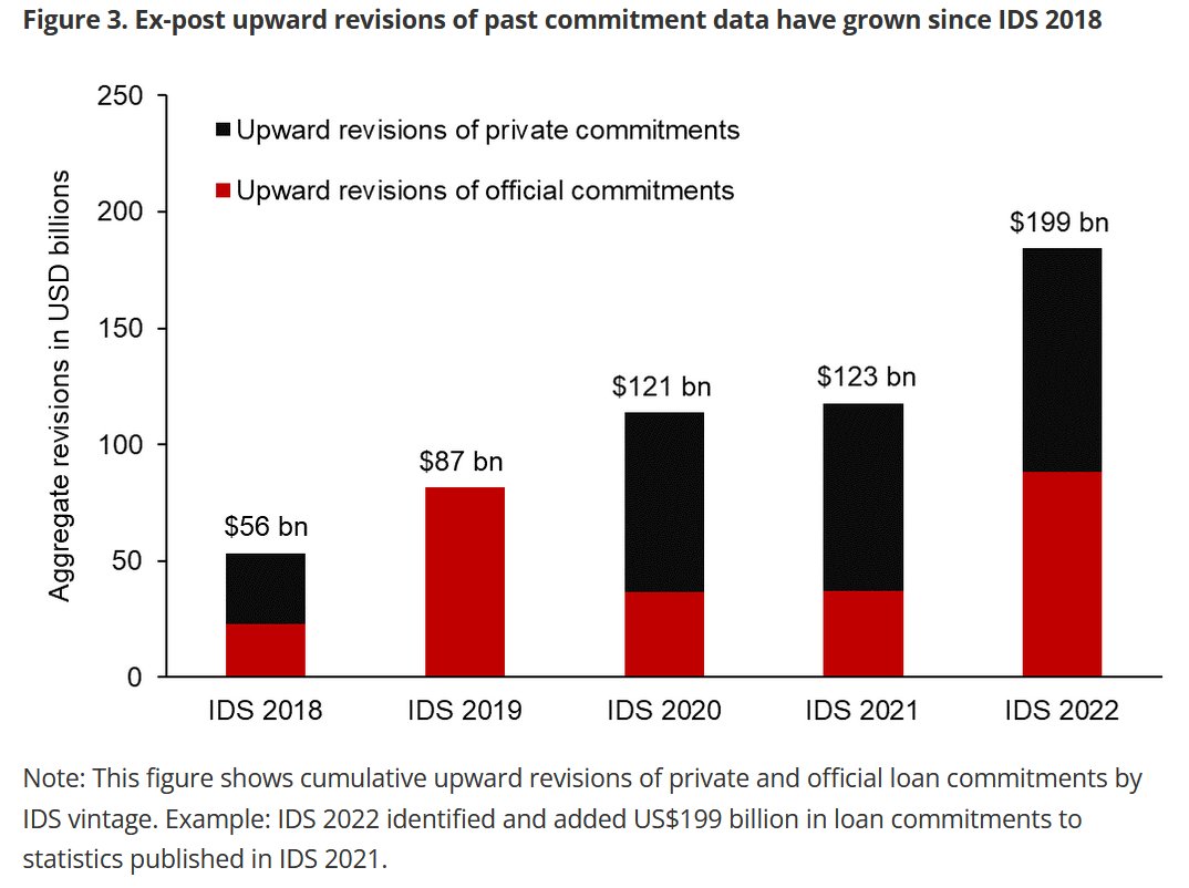 Our analysis also shows that recently published debt statistics had record levels of such upward revisions. IDS vintages released in past 5 years have identified $587 bn in previously unreported loan commitments. (15 % of relevant countries 2020 debt stocks).