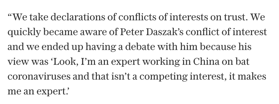 Daszak's explanation as to why he didn't have a conflict of interest is mind-bogglingly insane. Yet, instrad of taking down Daszak's fraudulent natural origins letter, the editor of the Lancet (himself a CCP stooge) spent a year negotiating with Daszak. What is going on?