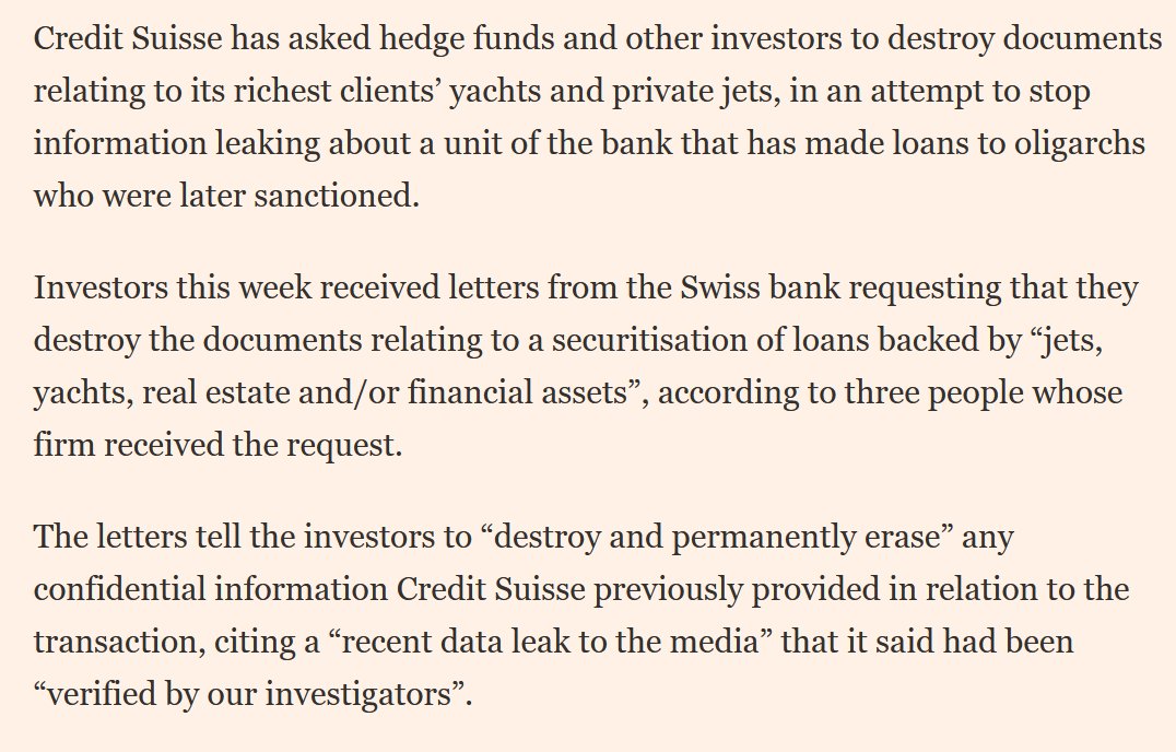 Credit Suisse asks hedge funds to destroy documents linking oligarch's loans for yachts, jets & real estate.